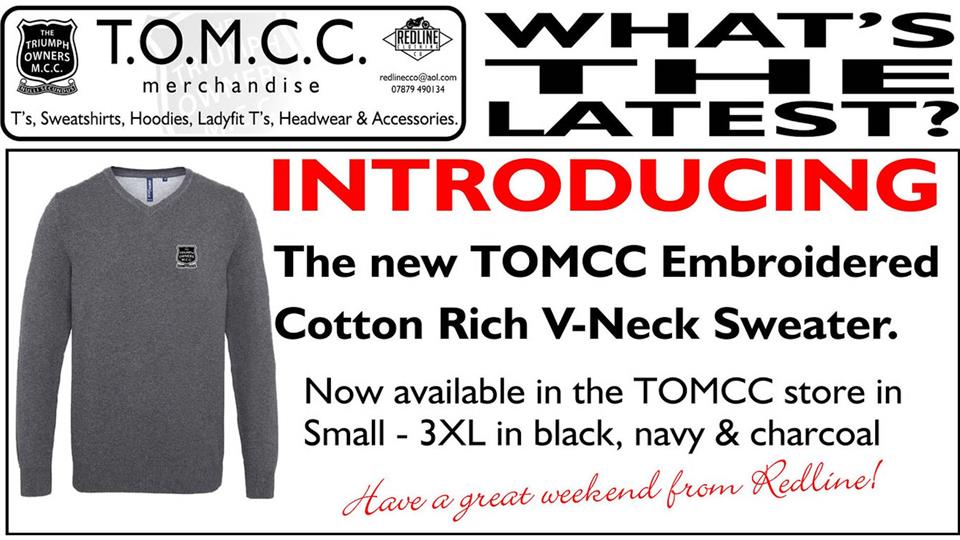 Now available in the TOMCC Merchandise store is an embroidered cotton-rich v-neck sweater which is available in black, navy, and charcoal and in sizes small to 3XL. We are always expanding our range and the designs available and our new distressed colour outline TOMCC logo is proving very popular.