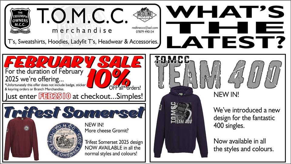 Lots of great news from Redline Clothing! For February we’re offering a 10% discount on all* TOMCC clothing & headwear. Just type FEB2510 at checkout to claim your savings. AND..We’ve just introduced 2 new designs onto the website. Just click on the link to order your merchandise ready for spring.