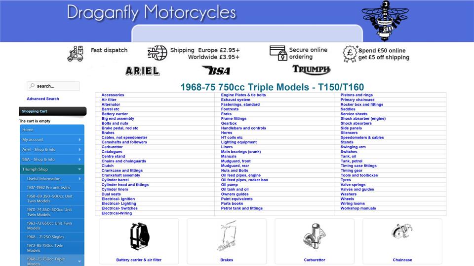 Draganfly's expansion into Triumph spares continues with TWO 750cc Triples sections! Owners of 1968-1975 T150 and T160 Triumphs as well as X75 models can now order parts online, using original Triumph part numbers or just by browsing the parts catalogue.