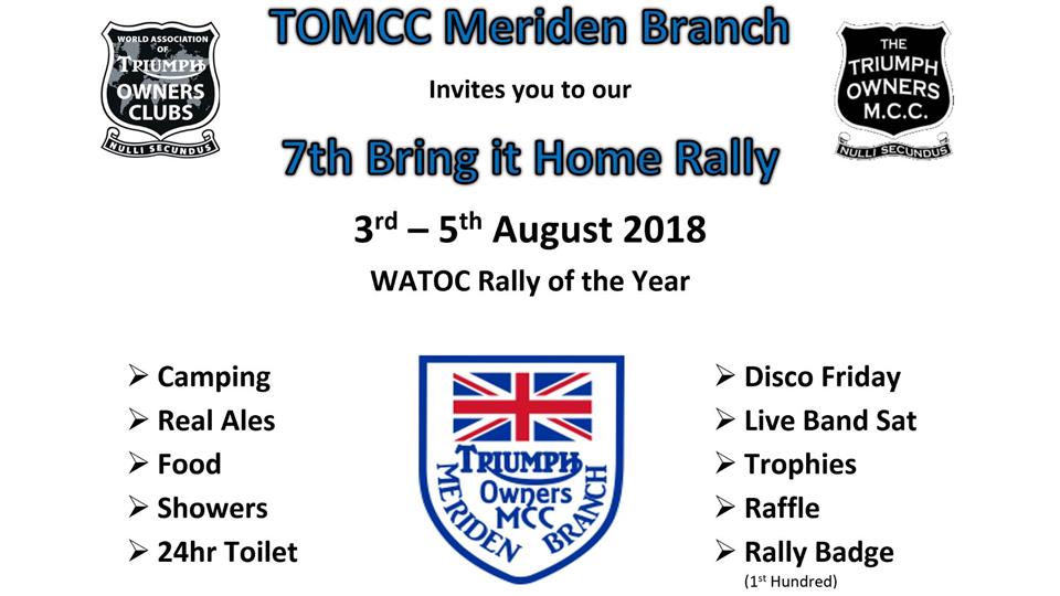 The Meriden Branch will hold their 7th Bring it Home Rally on 3rd to 5th August 2018. Tickets are £15 per person with £2 discount if ordered before the event. It is being held at the Barkers' Butts Rugby Football Club, Pickford Grange Lane, Allesley, Coventry, CV5 9AR with entry from midday Friday.