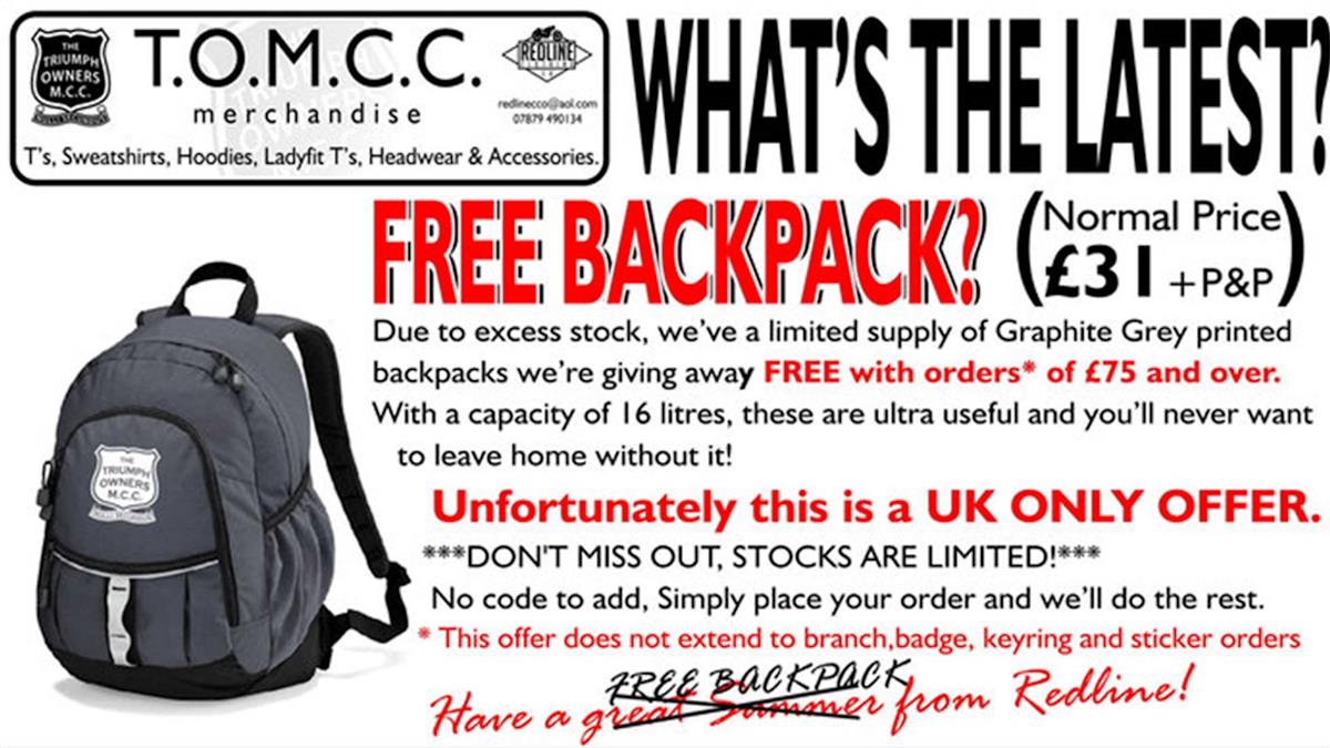 UK Only. Due to excess stock, we've a limited supply of Graphite Grey printed backpacks that we're giving away free with orders* of £75 or more. If you see this ad on the home page of the TOMCC Merchandise site they're still available.